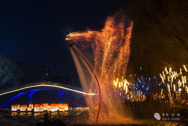 “打鐵花”非遺表演與“水上飛人”特技聯(lián)袂獻技——當(dāng)萬千鐵花如流星般騰空傾瀉,水上飛人手持火壺在空中旋轉(zhuǎn)翻騰,人群中爆發(fā)出陣陣驚嘆。來自山東的攝影愛好者林先生說:“三國文化搭配非遺鐵花,這種組合很有新意,拍出來的效果特別好。”